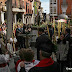 El paso de "El Descendimiento" en la puerta de la Iglesia Penitencial de la Santa Vera Cruz, de donde sale para participar en la Procesión General del Viernes Santo alumbrado por su Cofradía titular.